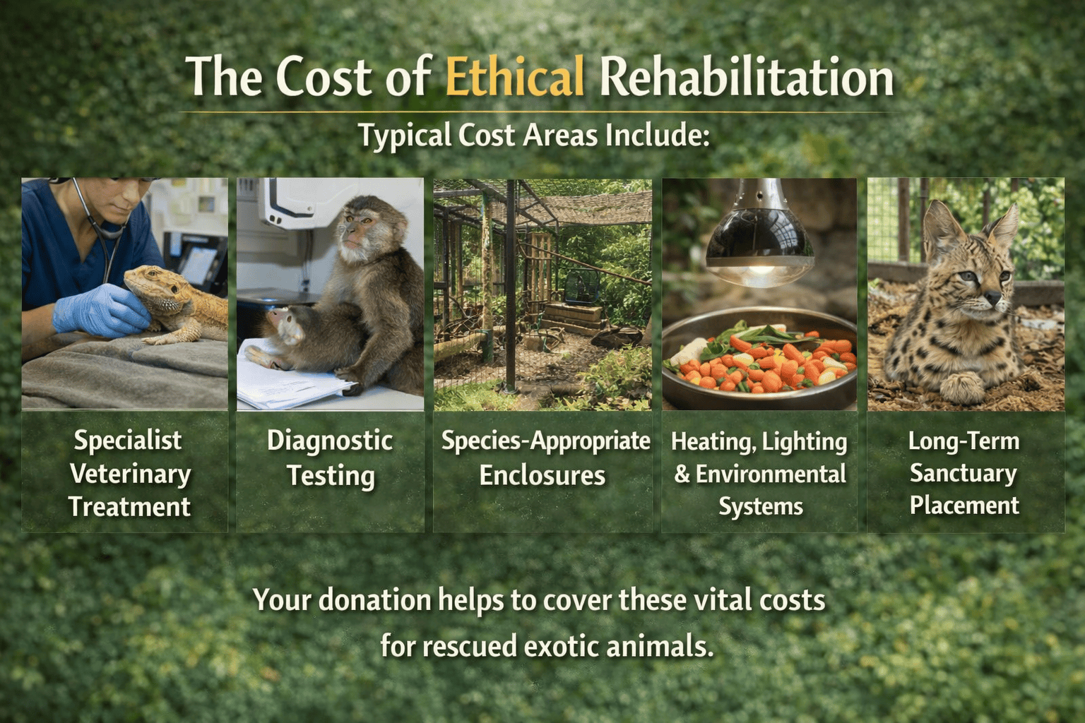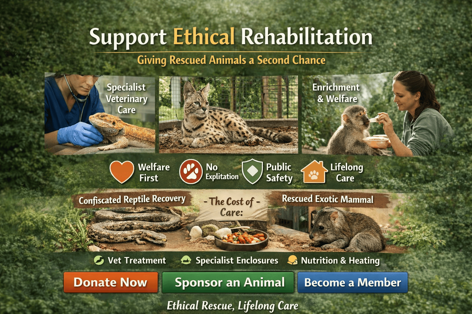 At the Association of Protecting Exotic Species CIC (APES CIC), we follow a structured, welfare-first rehabilitation pathway designed to prioritise both animal wellbeing and public safety.